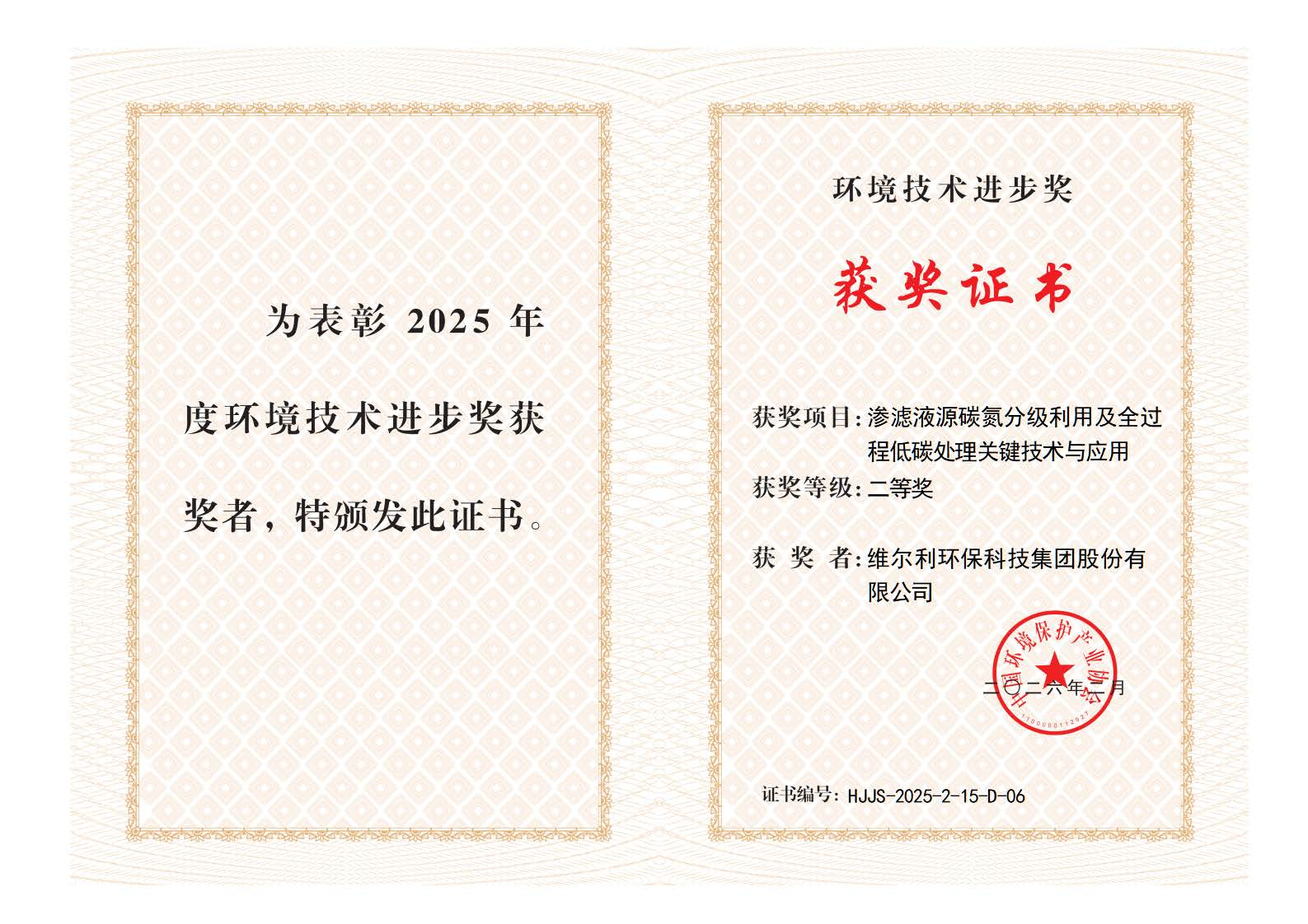 环境技术进步奖是经国家科学技术奖励工作办公室备案的全国性行业科技奖项,此次双奖加身,是行业对维尔利技术创新能力与环保贡献的高度认可。